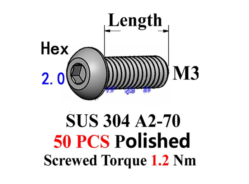 เรามีสกรู M3x2.5 M3x4 M3x5 M3x6 M3x8 M3x10 M3x12 M3x14 M3x16 M3x18 M3x20 M3x22 M3x25 M3x30 M3x35 M3x40 M3x45 M3x45 M3x50 ในสต็อก หัวปุ่ม Hex 2.0 ไดรเวอร์ SUS 304,A2-70, ขัดเงา ROHS แรงบิด 1.2 Nm. ภาพวาดคือ M3x10