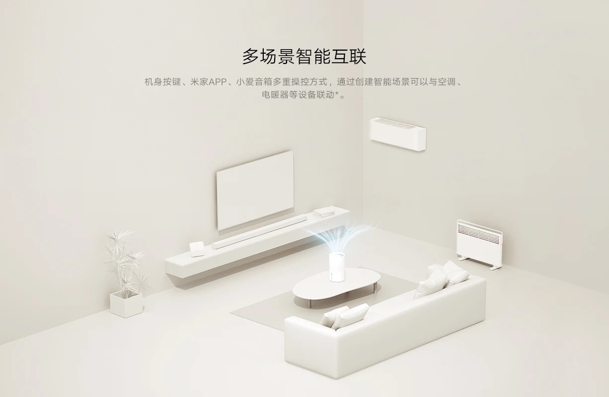 Control the device via the machine’s buttons or the Mi Home app. You can create smart scenarios to link it with other devices like air conditioners and heaters.