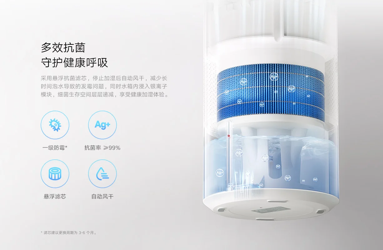 It uses a suspended antibacterial filter core that dries automatically after humidification, reducing the risk of mold caused by long-term water immersion. Additionally, there’s a silver ion module inside the water tank, progressively reducing bacterial growth, ensuring a healthy humidification experience.